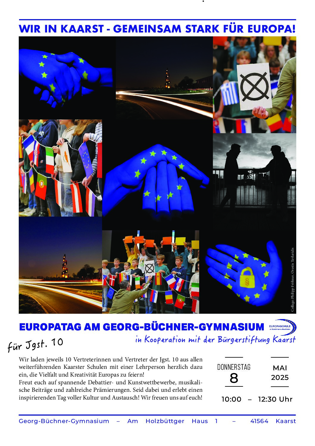 Wir in Kaarst – gemeinsam stark für Europa 8. Mai 2025 Der diesjährige Europatag im Georg-Büchner-Gymnasium am 08.05.2025 hatte zwei Schwerpunkte: Zum einen ein Debattierwettbewerb zum Thema „Soll ein einjähriges Dienstjahr für junge Menschen über 18 Jahre EU-weit eingeführt werden?“ Und zum anderen ein Kreativwettbewerb zum Thema „Wir in Kaarst - gemeinsam stark für Europa“. Mehr... |